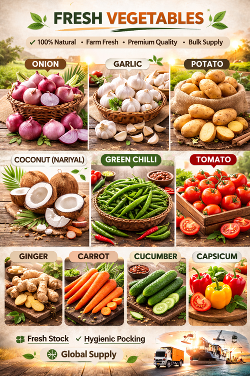 Premium Fresh Vegetables Supplier – Onion, Garlic, Potato & Green Chilli (Bulk Available)
